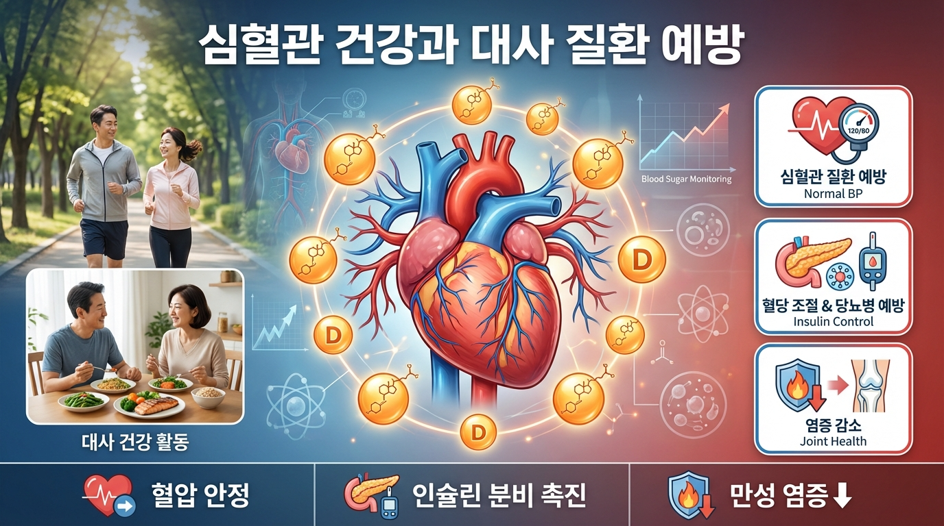 비타민D가 부족하면 혈압이 높아지고 혈관 건강이 나빠진다는 연구 결과들이 있어요. 40대가 되면서 고혈압, 고지혈증 같은 게 생기기 쉬운데, 비타민D가 충분하면 이런 심혈관 질환을 예방하는 데 도움이 된답니다. 우리 엄마, 아빠 세대도 신경 써야 할 부분이니 참고해두세요.