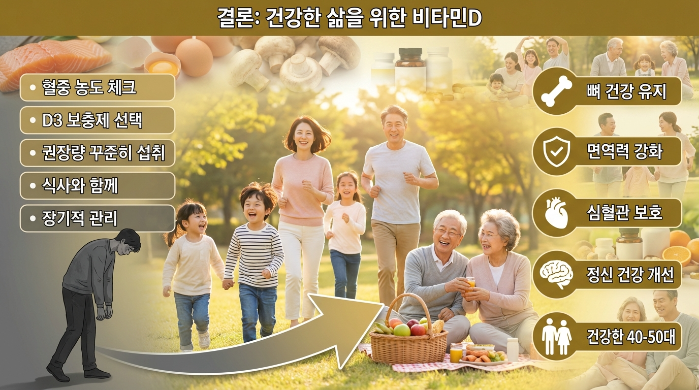 결론: 비타민D는 우리 몸의 작은 경비관 같은 존재예요. 뼈부터 면역력, 심장 건강, 심지어 뇌 기능까지 정말 많은 곳에서 조용히 일하고 있거든요. 특히 실내 생활이 많고 갱년기 진입을 앞두고 있는 40대 주부라면, 비타민D 수치를 한 번쯤 체크해보고 부족하다면 적절한 보충제로 관리하세요. 과다 섭취는 피하되, 권장량 범위 내에서 꾸준히 섭취하면 10년 뒤 당신의 몸과 마음이 분명히 달라져 있을 거예요. 지금 시작해도 늦지 않아요. 건강한 40대, 더 나아가 건강한 50대를 위해 작은 관심 하나가 모여 큰 변화를 만든답니다.