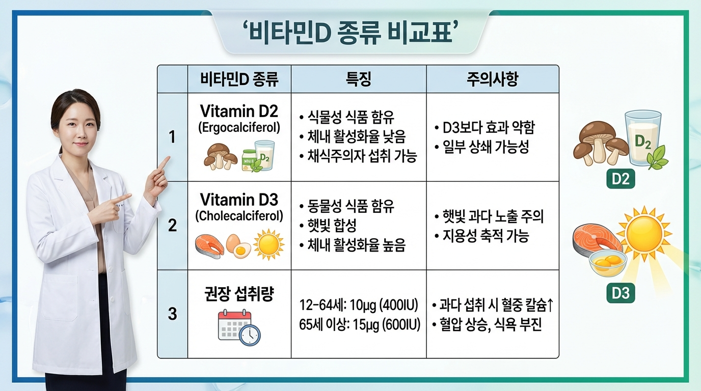 식물성 식품과 효모에 함유, 체내 활성화율이 D3보다 낮음, 채식주의자도 섭취 가능 | D3보다 효과가 약할 수 있고, 일부 연구에서는 D3 효과를 상쇄할 가능성 제시 |