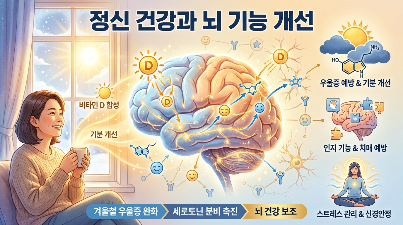 겨울이 되면 특히 우울해지는 사람들 많잖아요. 그건 햇빛 부족으로 비타민D 합성이 줄어들기 때문이에요. 비타민D는 뇌에서 행복 호르몬이라 불리는 세로토닌 분비를 촉진한답니다. 겨울철 우울증으로 힘들다면 비타민D 보충이 정말 도움이 될 수 있어요.