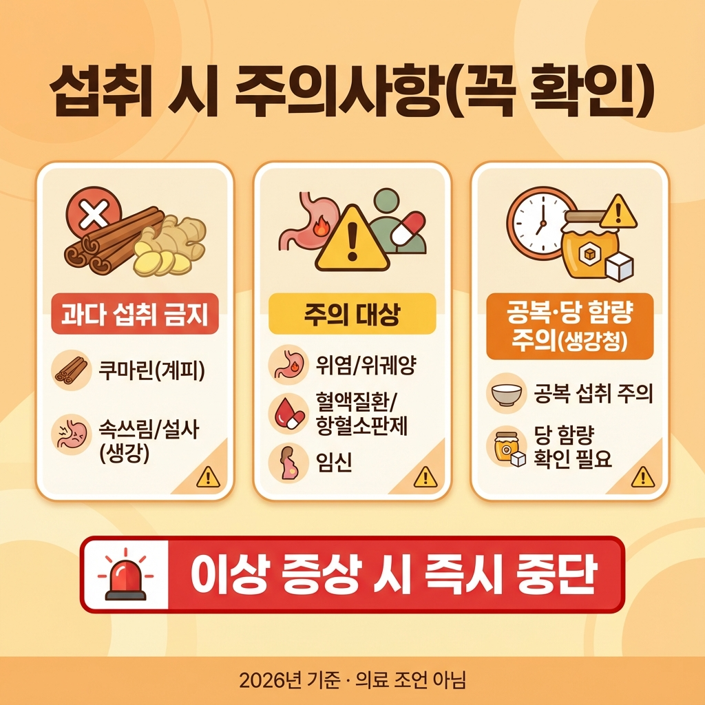 본 포스팅의 정보는 교육 및 정보 제공 목적으로 제공되며, 의료 조언이 아닙니다. 계피 생강차를 복용하기 전에 특히 위염, 위궤양, 혈액 질환, 약물 복용 중이신 분들은 반드시 의료 전문가와 충분한 상담을 진행하세요. 개인의 건강 상태에 따라 효능과 부작용이 다를 수 있습니다. 이상 증상이 나타나면 즉시 섭취를 중단하고 의료진의 진단을 받으세요.